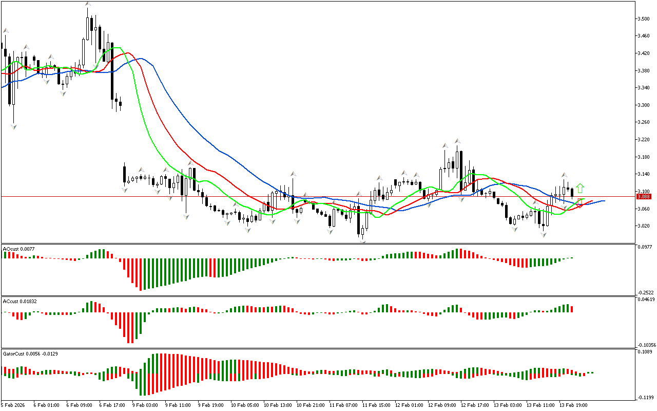 Gator indikatorining gistogrammasi hali aniq signal hosil qilmagan. Gistogrammalarning rangi o’zgaradi, bu bozor fazasining o’zgarishini ko’rsatadi.