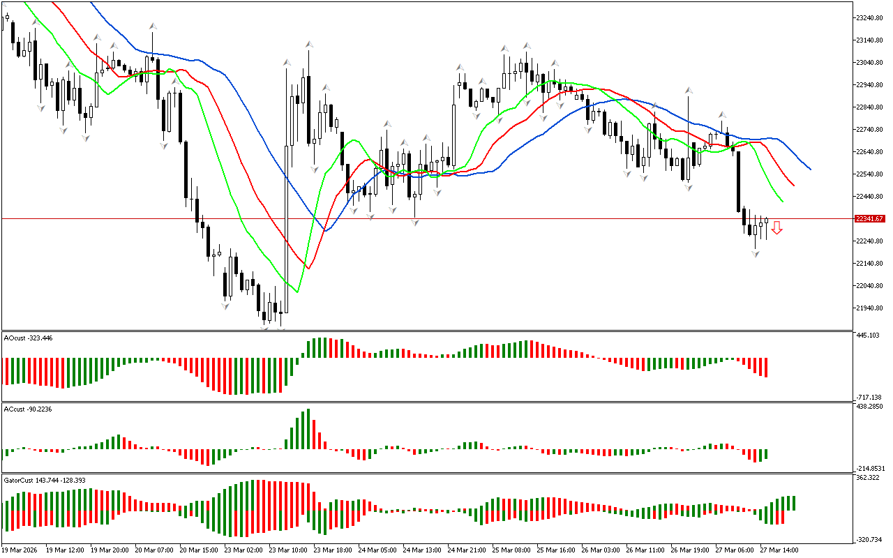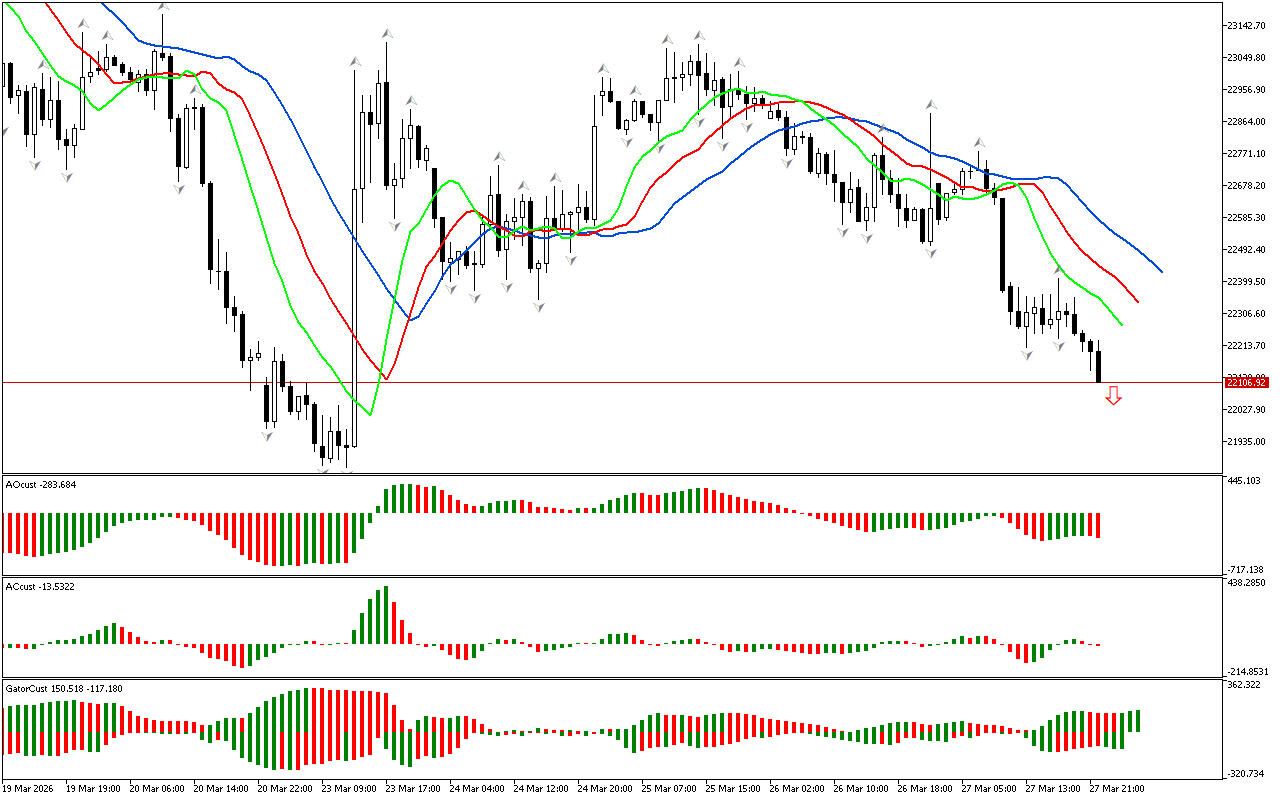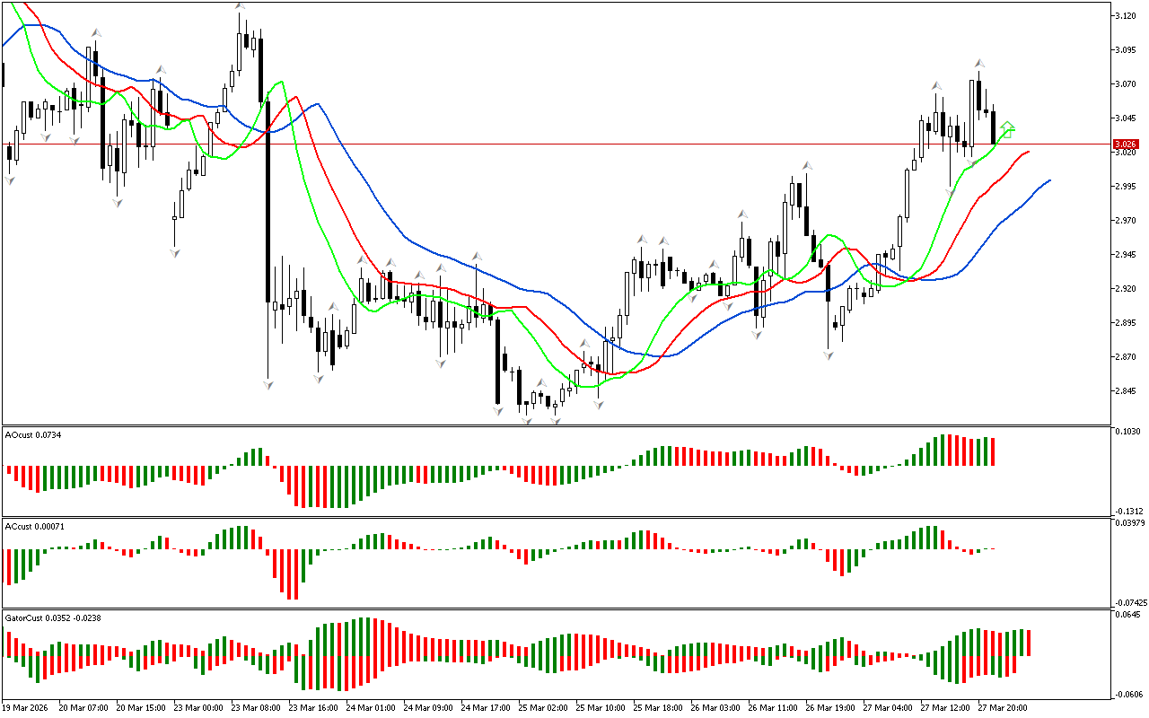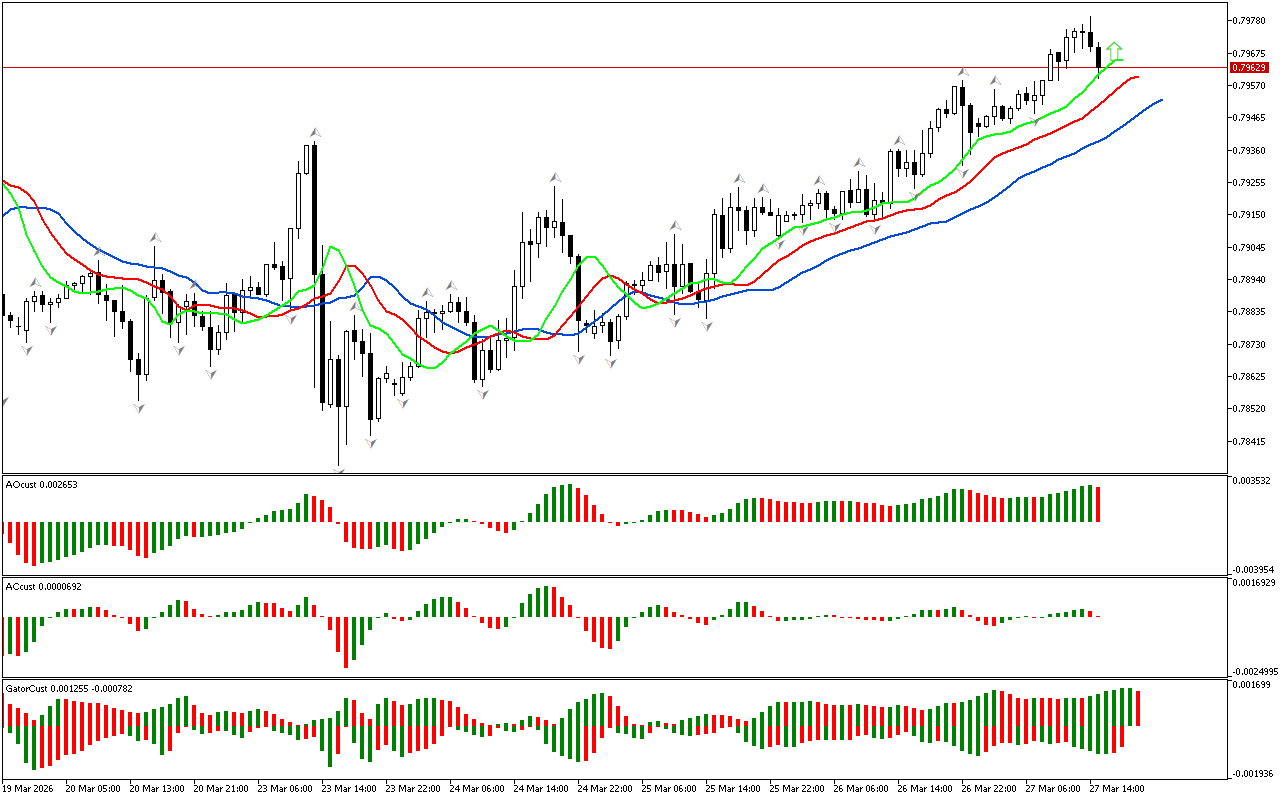 Οι τελευταίες ράβδοι στα γραφήματα AC και AO είναι πράσινες. Οι δείκτες σηματοδοτούν ότι η δύναμη και η ενέργεια της νότιας ώθησης παρουσιάζουν επιβράδυνση. Μπορεί να είναι είτε μια αντιστροφή της τοπικής τάσης είτε ένα μήνυμα για την ανάπτυξη μιας διόρθωσης. Ωστόσο, ενώ η τιμή είναι κάτω από τον δείκτη Alligator, η κίνηση προς τη νότια κατεύθυνση παραμένει διαδεδομένη.