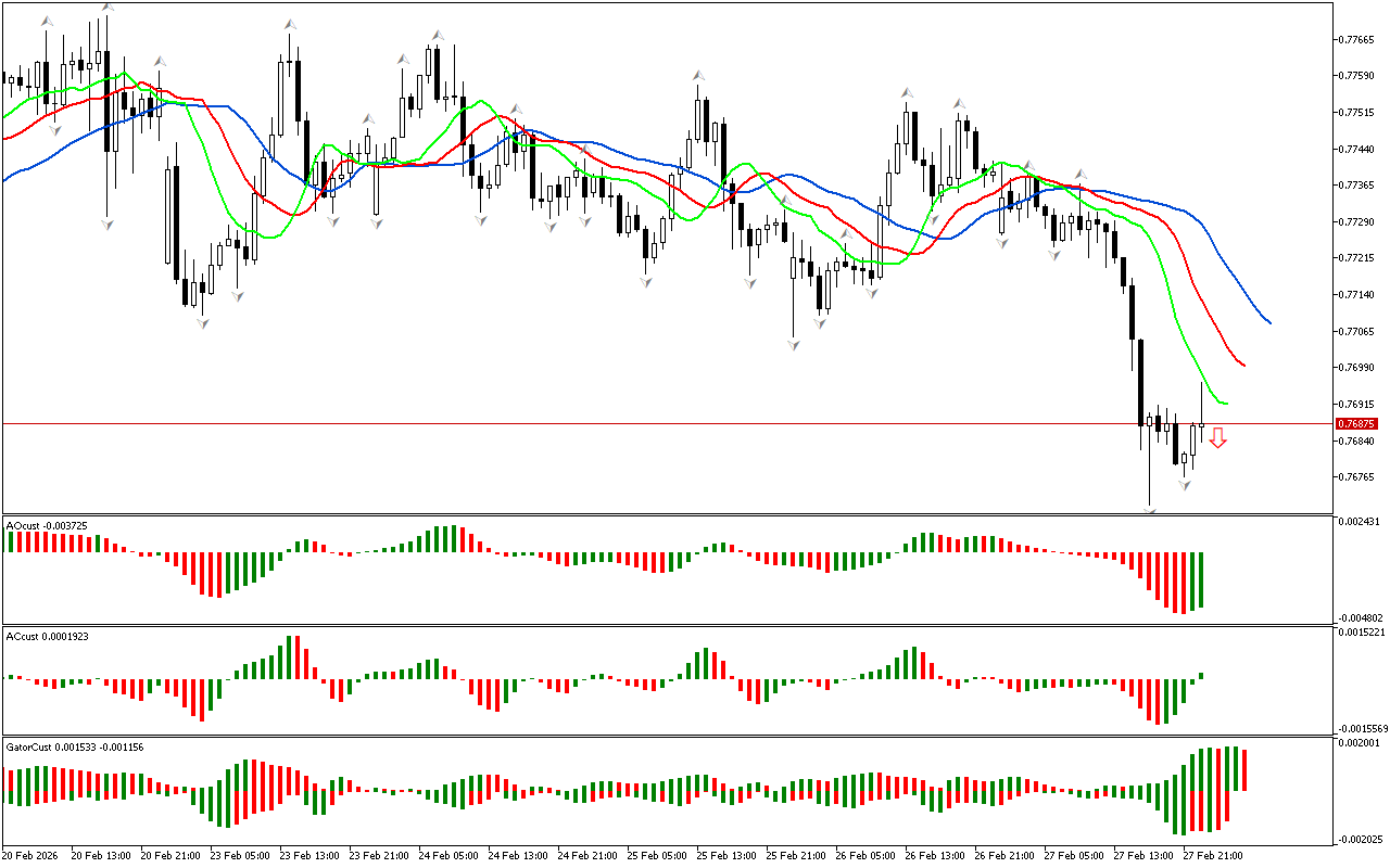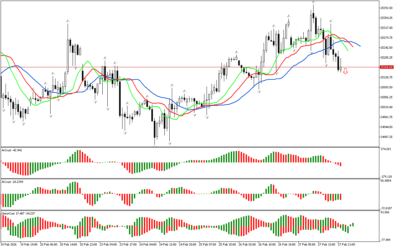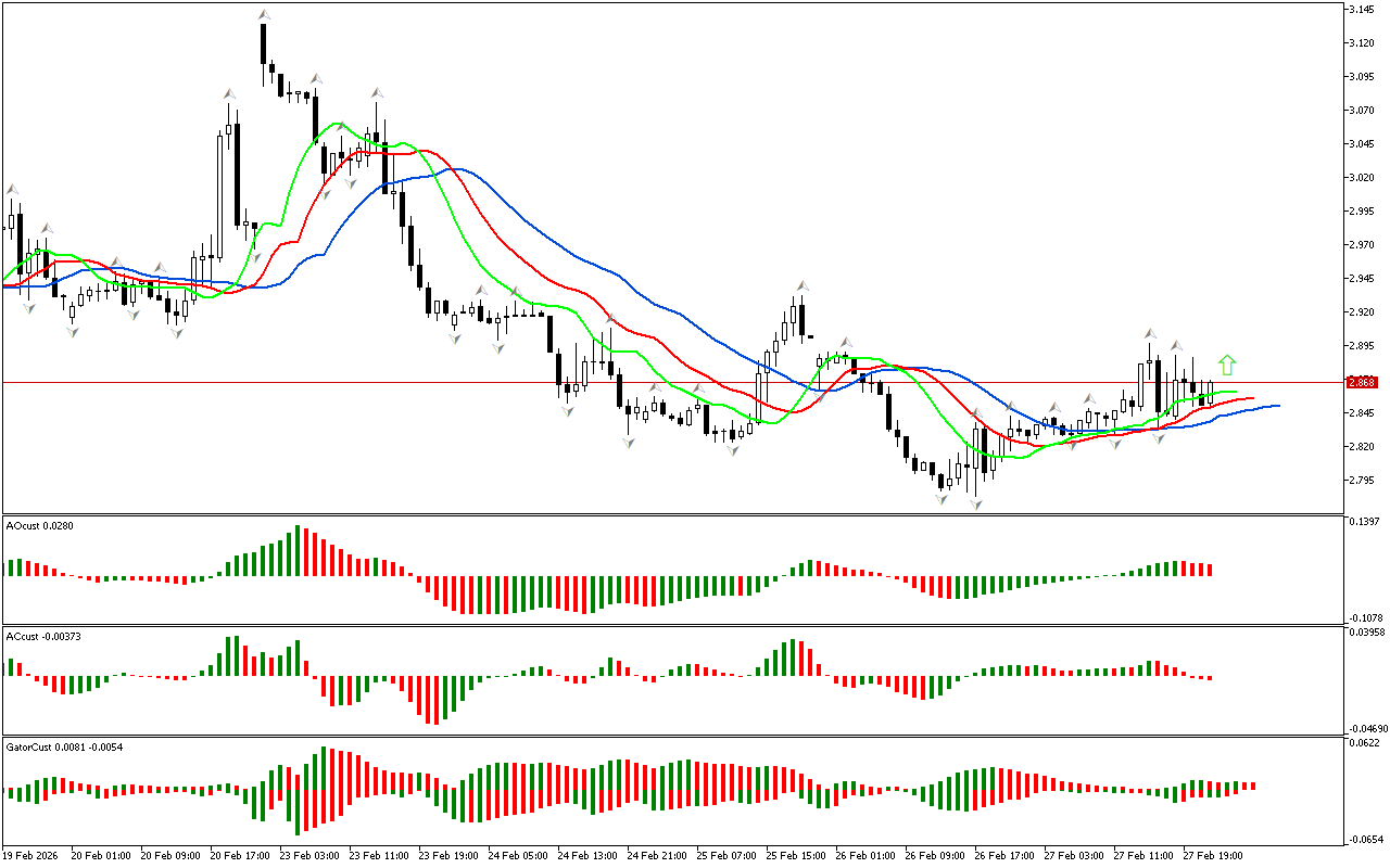 Gator indikatorunun histoqramı hələ aydın siqnal yaratmayıb. Histoqramların rəngi dəyişir, bu da bazar fazasının dəyişməsini göstərir.