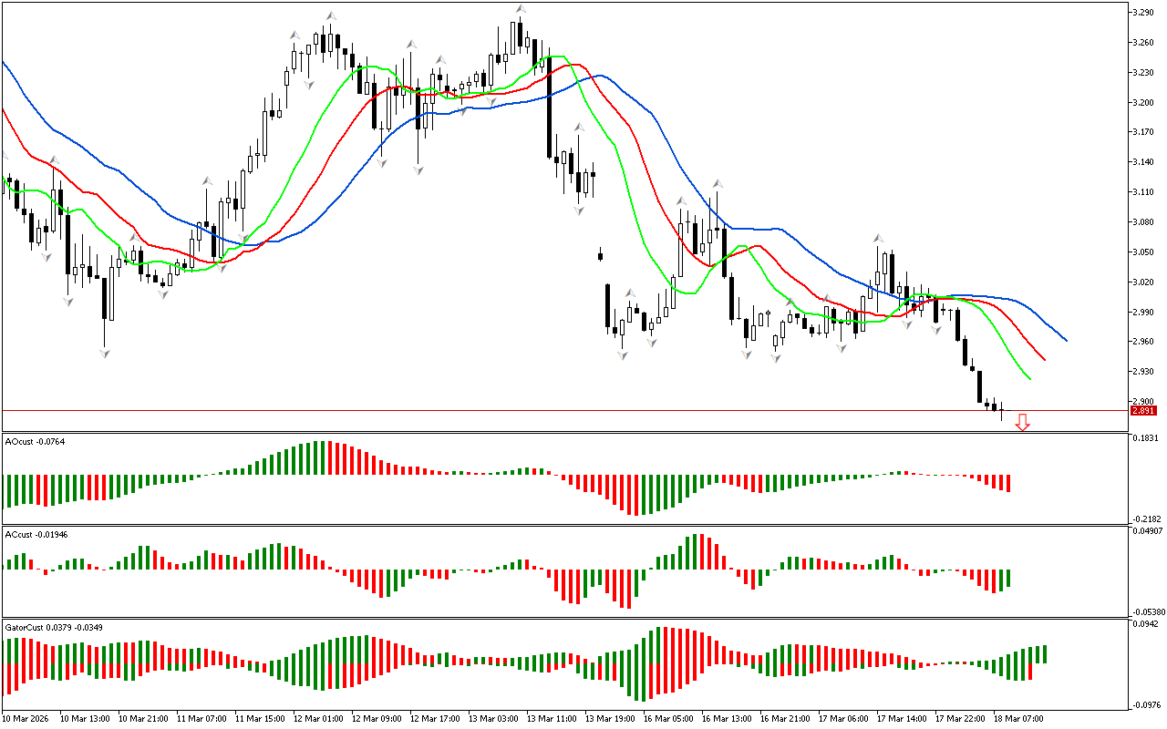 Gator indikatorunun histoqramı hələ aydın siqnal yaratmayıb. Histoqramların rəngi dəyişir, bu da bazar fazasının dəyişməsini göstərir.