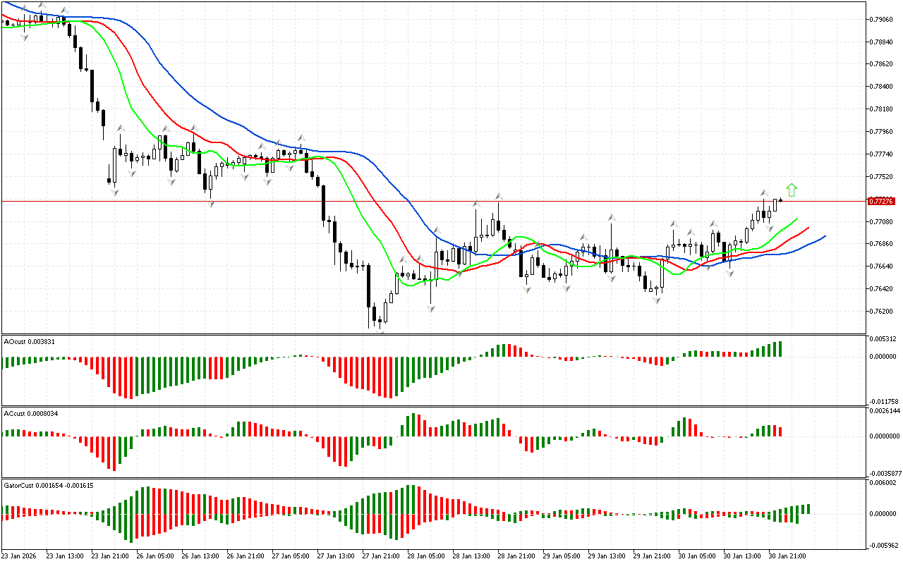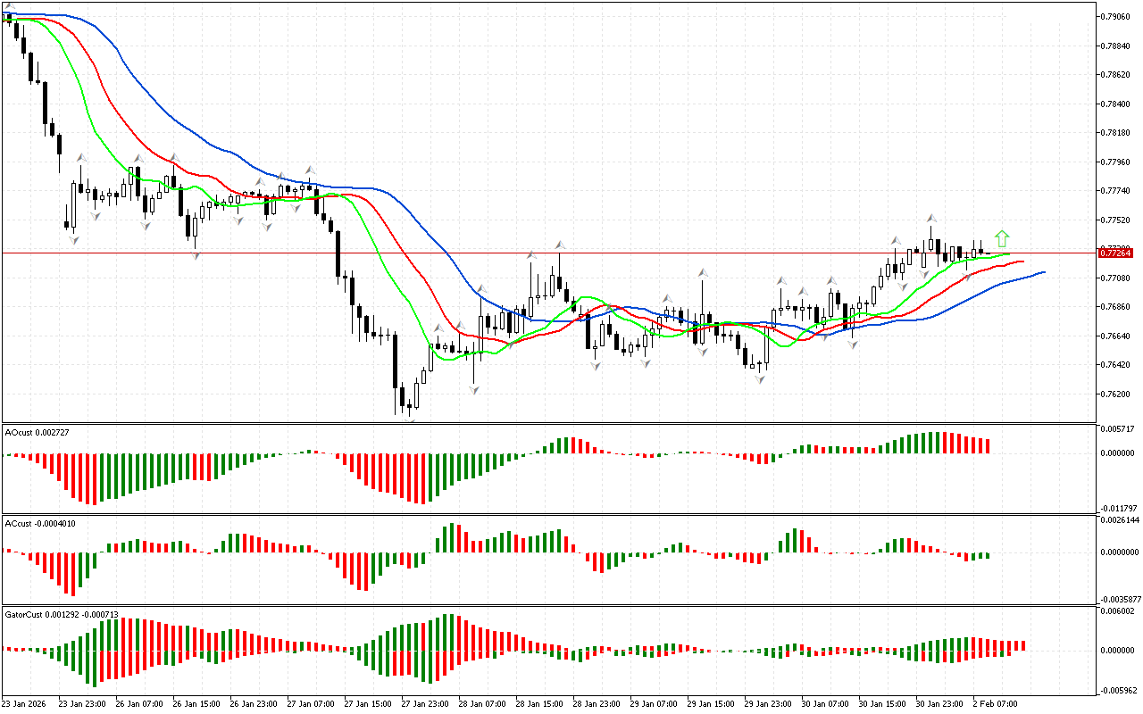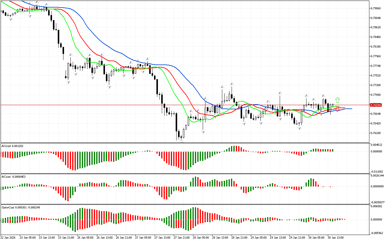 На индикаторе АС наблюдаются два красных бара, которые расположены ниже нулевой линии. Это сигнал, на который стоит обратить внимание. Он указывает на снижение энергии движения на север. Тем не менее, движение вверх остается приоритетным, пока цена удерживается выше красной линии Аллигатора. После завершения коррекции цена может возобновить движение вниз.