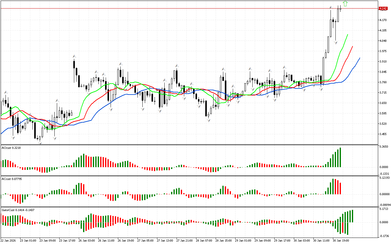 Индикатор Аллигатор подтверждает позитивное настроение рынка. Пасть Аллигатора открыта. Он хочет есть. На этом фоне цена может продолжить движение вверх.
