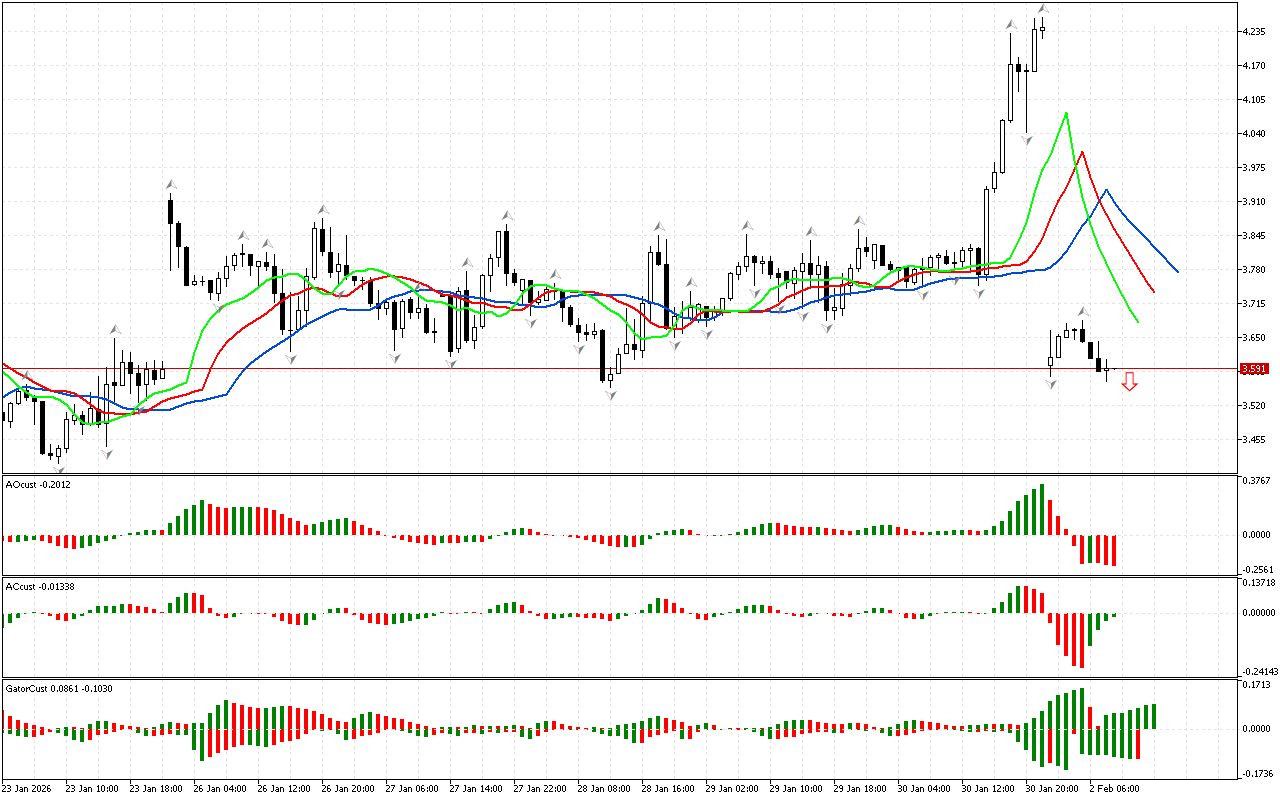Gator рисует серию красных столбцов. Этот сигнал говорит нам о формировании коррекции.
