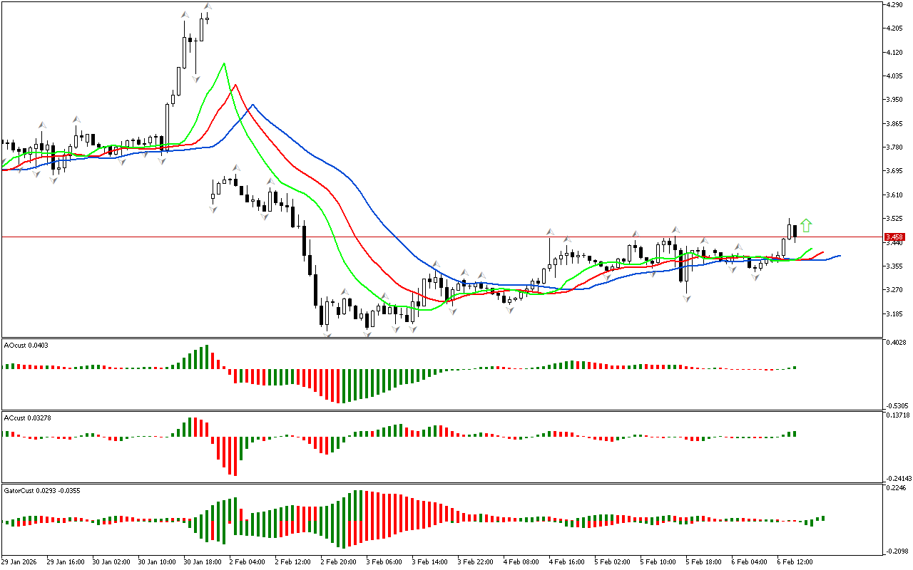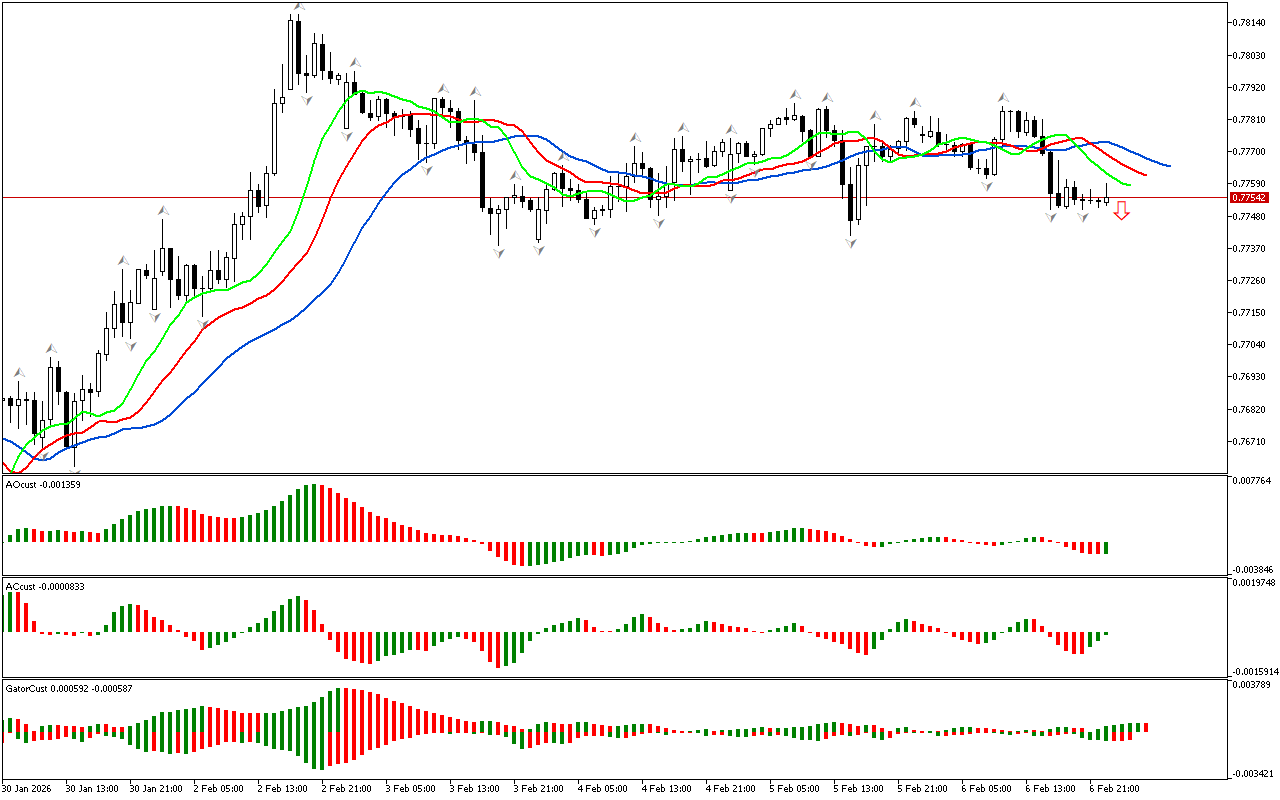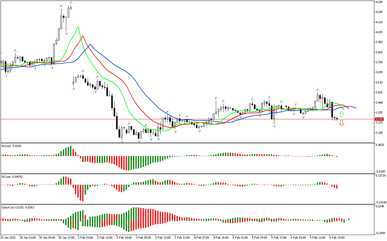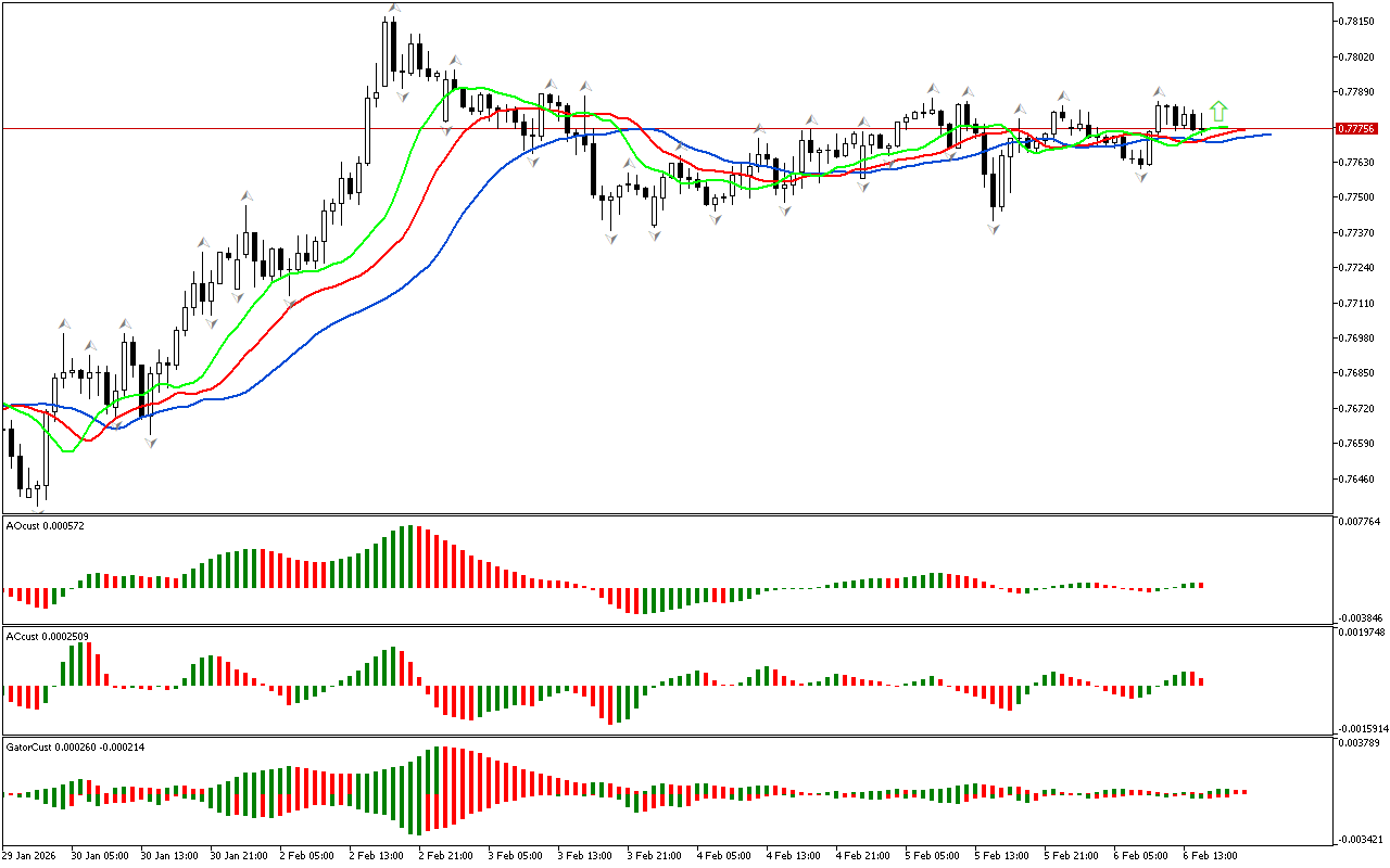 Gator indikatori gistogrammalarining rangi oʻzgaradi, shuning uchun bu indikator hali aniq signal hosil qilmagan.