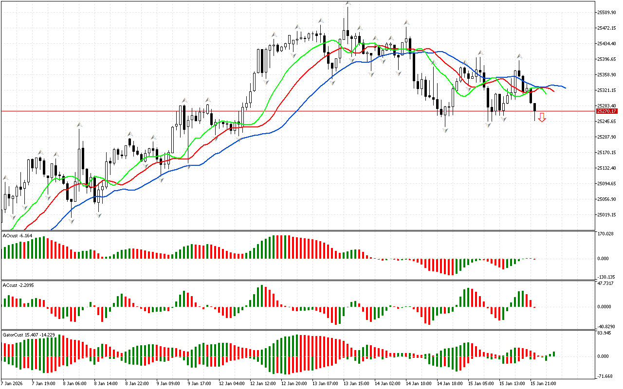 The red bars located above the zero mark on the Accelerator Oscillator indicator show a decrease in the energy of the upward movement. However, as long as the price remains above the Alligator’s red line, the price growth is expected.