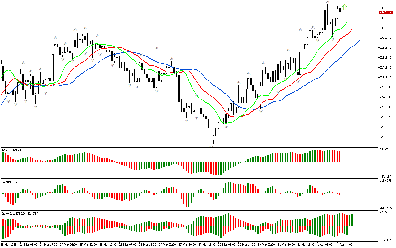 Сонымен бірге Awesome Oscillator гистограммасы қазір нөлдік сызықтан жоғары.