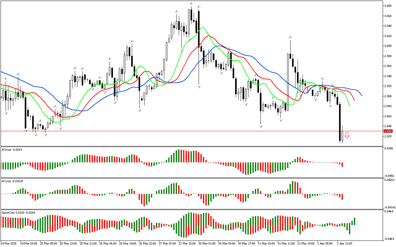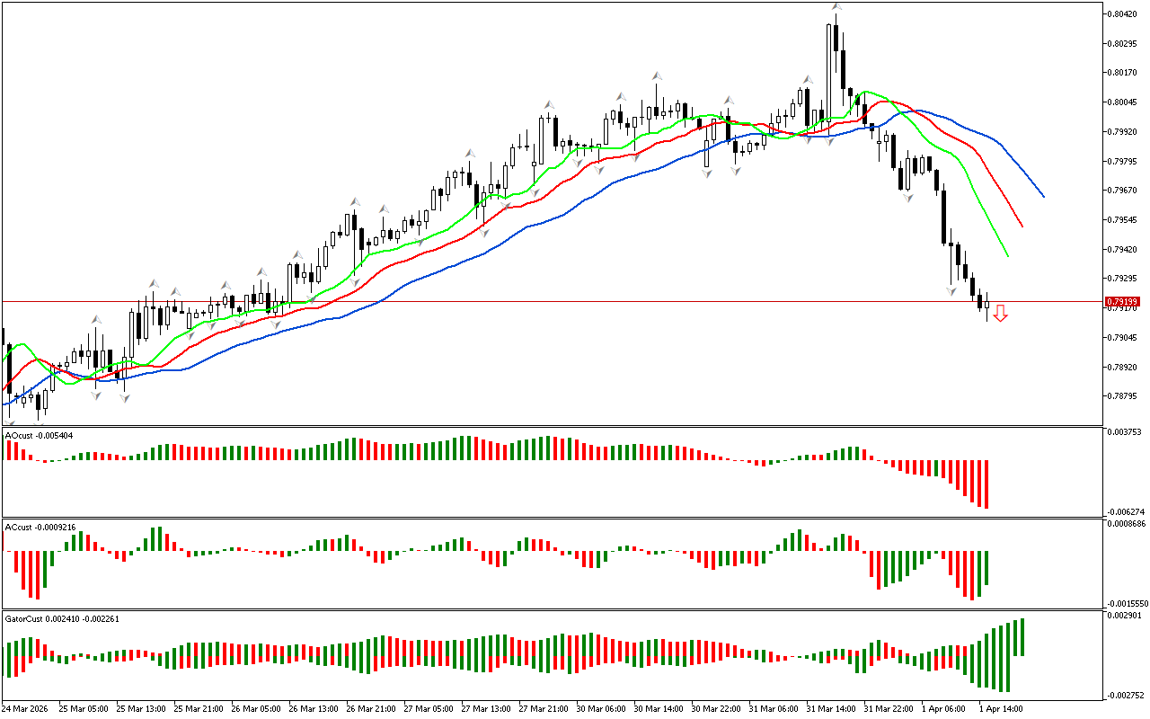 Accelerator Oscillator көрсеткіштердегі нөл белгісінің астында орналасқан қызыл жолақтар жоғары қозғалыс энергиясының азайғанын көрсетеді. Дегенмен, баға Аллигатордың қызыл сызығынан жоғары болғанша, бағаның өсуі күтілуде.