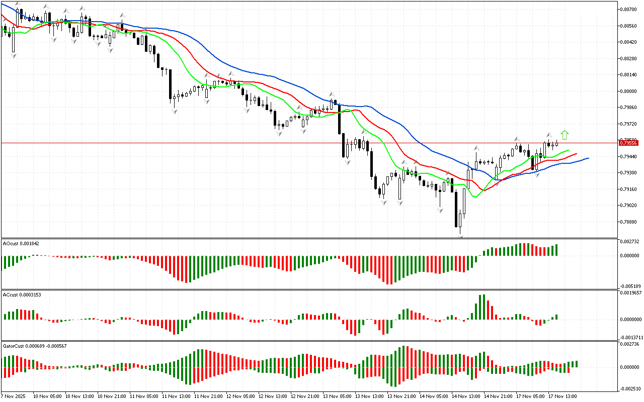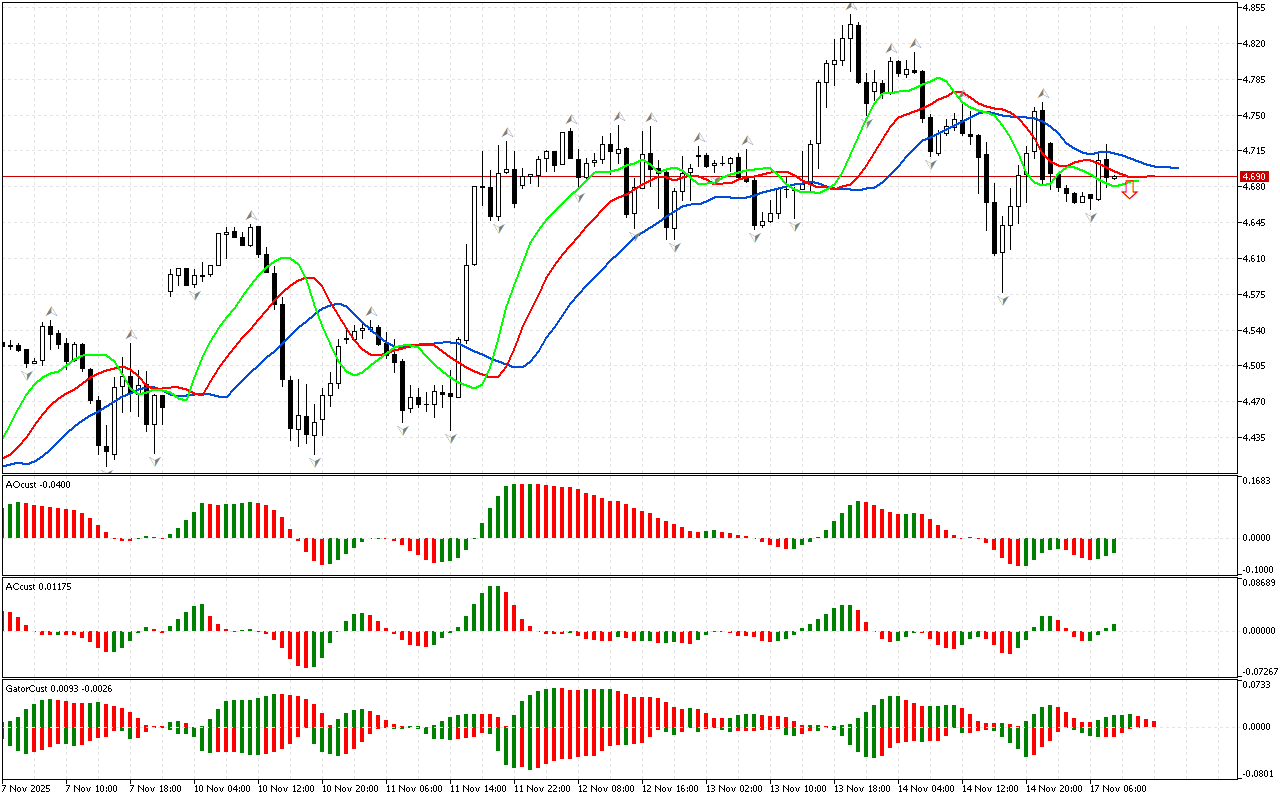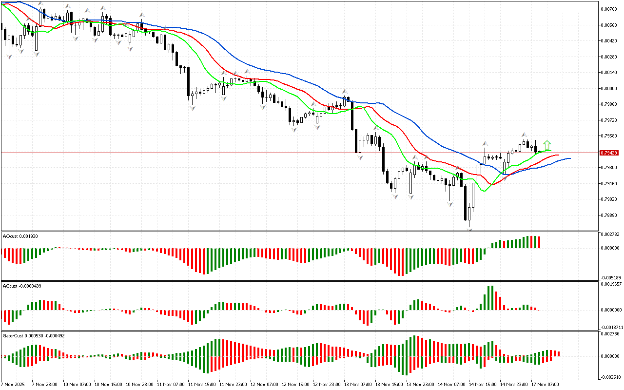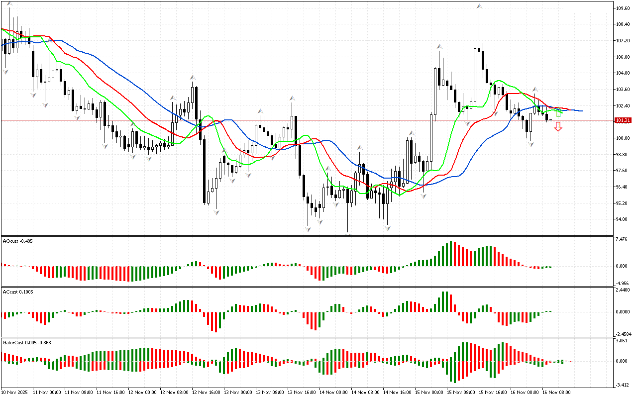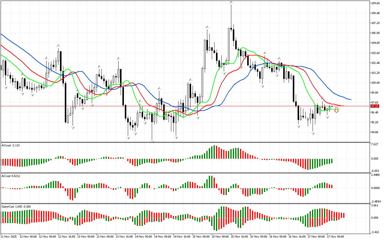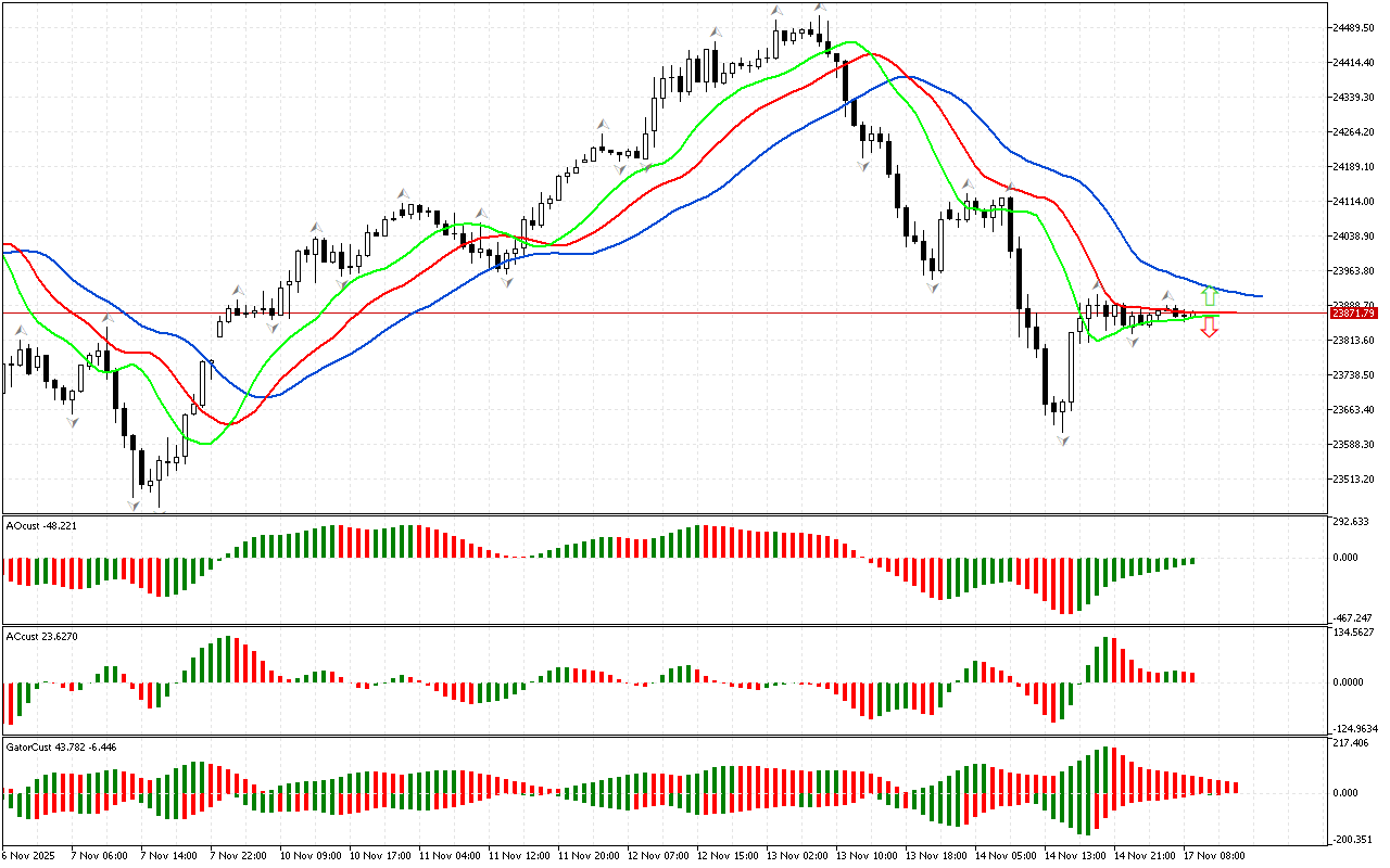 Gator indikatori gistogrammalarining rangi oʻzgaradi, shuning uchun bu indikator hali aniq signal hosil qilmagan.