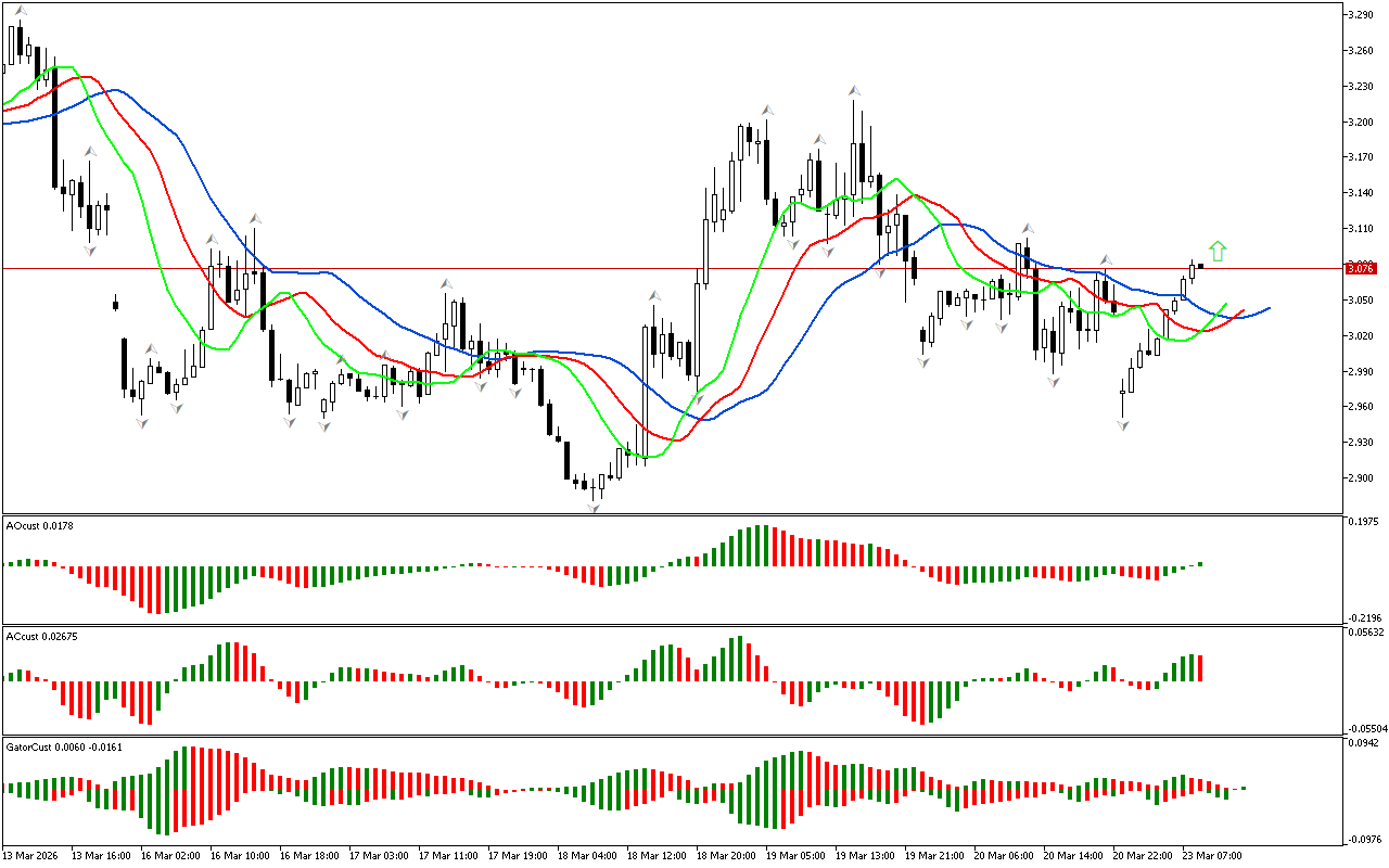 Gator indikatorining gistogrammasi hali aniq signal hosil qilmagan. Gistogrammalarning rangi o’zgaradi, bu bozor fazasining o’zgarishini ko’rsatadi.