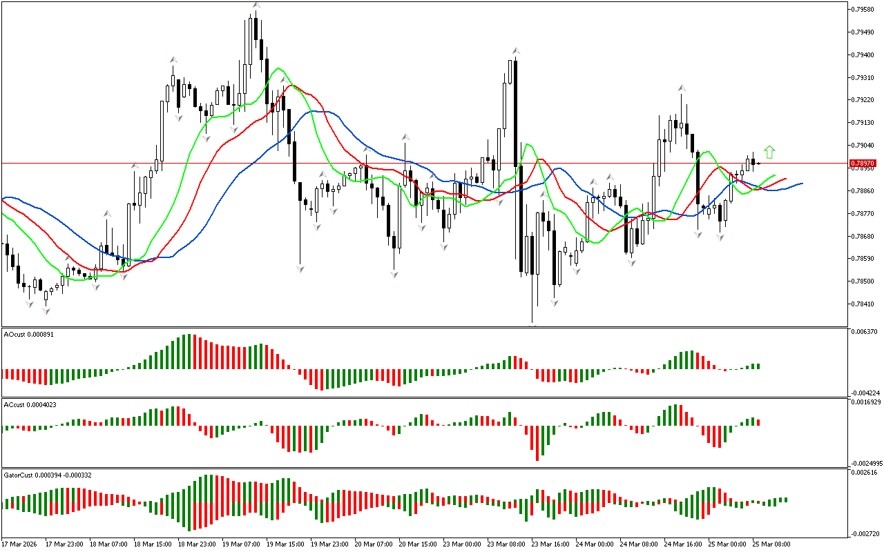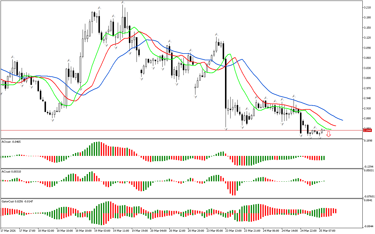 Gator indikatorining gistogrammasi hali aniq signal hosil qilmagan. Gistogrammalarning rangi o’zgaradi, bu bozor fazasining o’zgarishini ko’rsatadi.