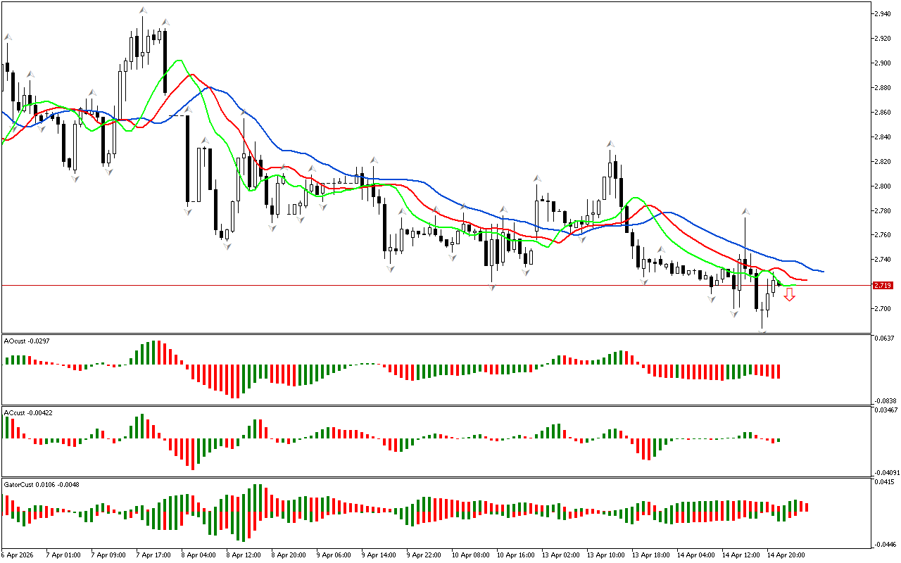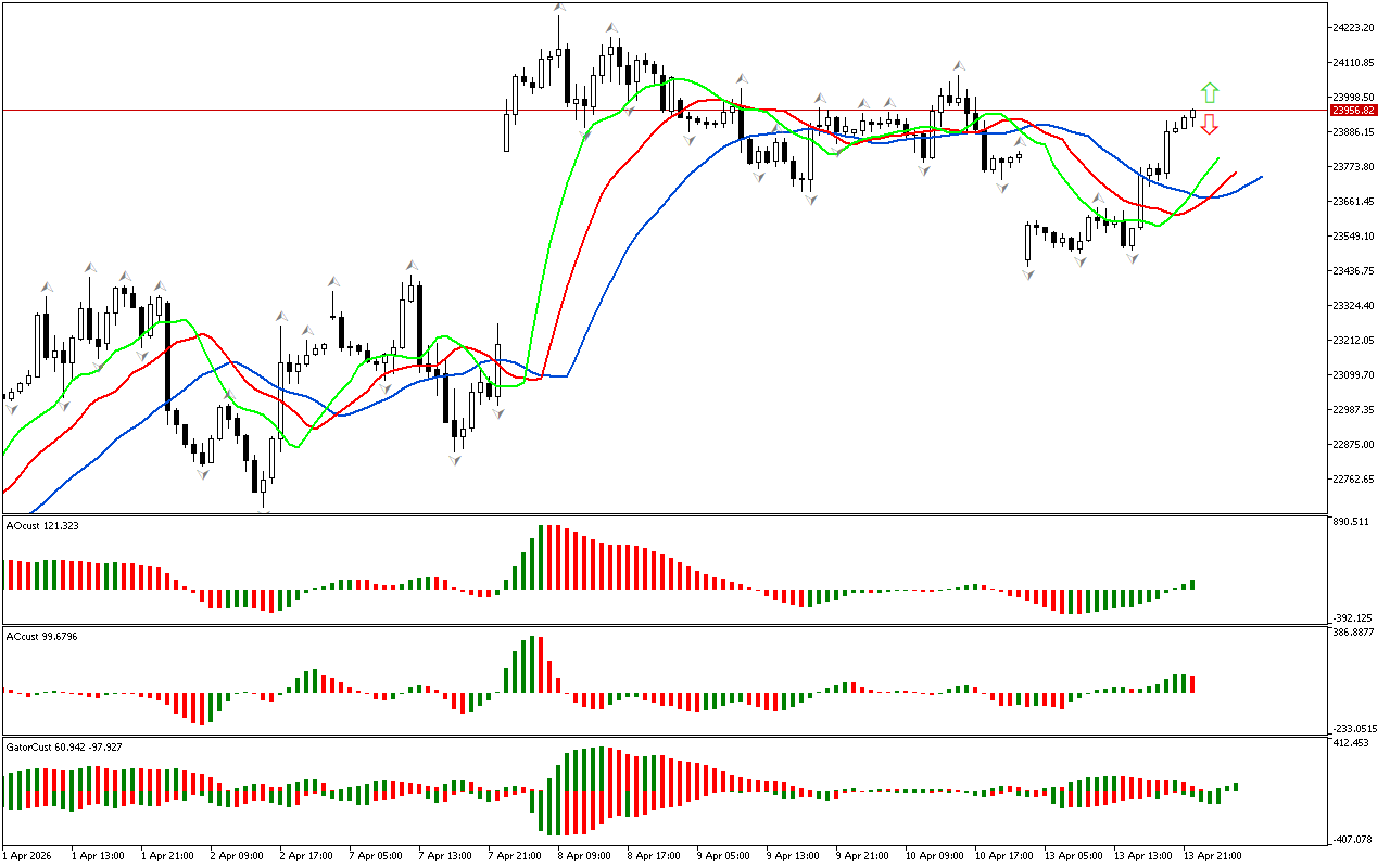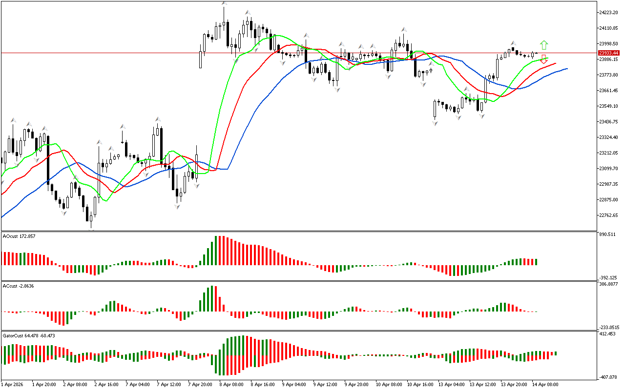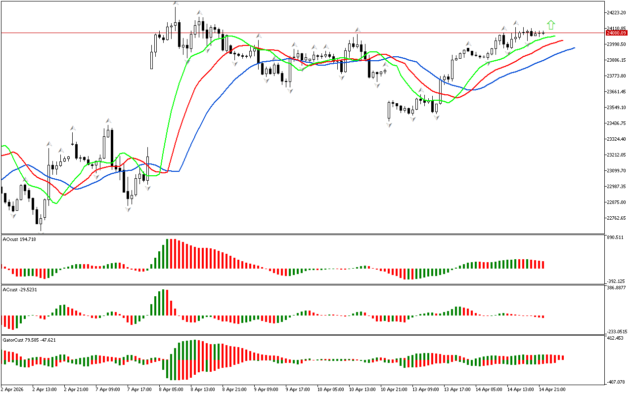 Gator indikatorining gistogrammasi hali aniq signal hosil qilmagan. Gistogrammalarning rangi o’zgaradi, bu bozor fazasining o’zgarishini ko’rsatadi.