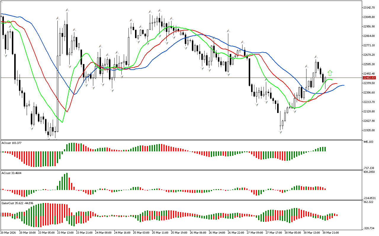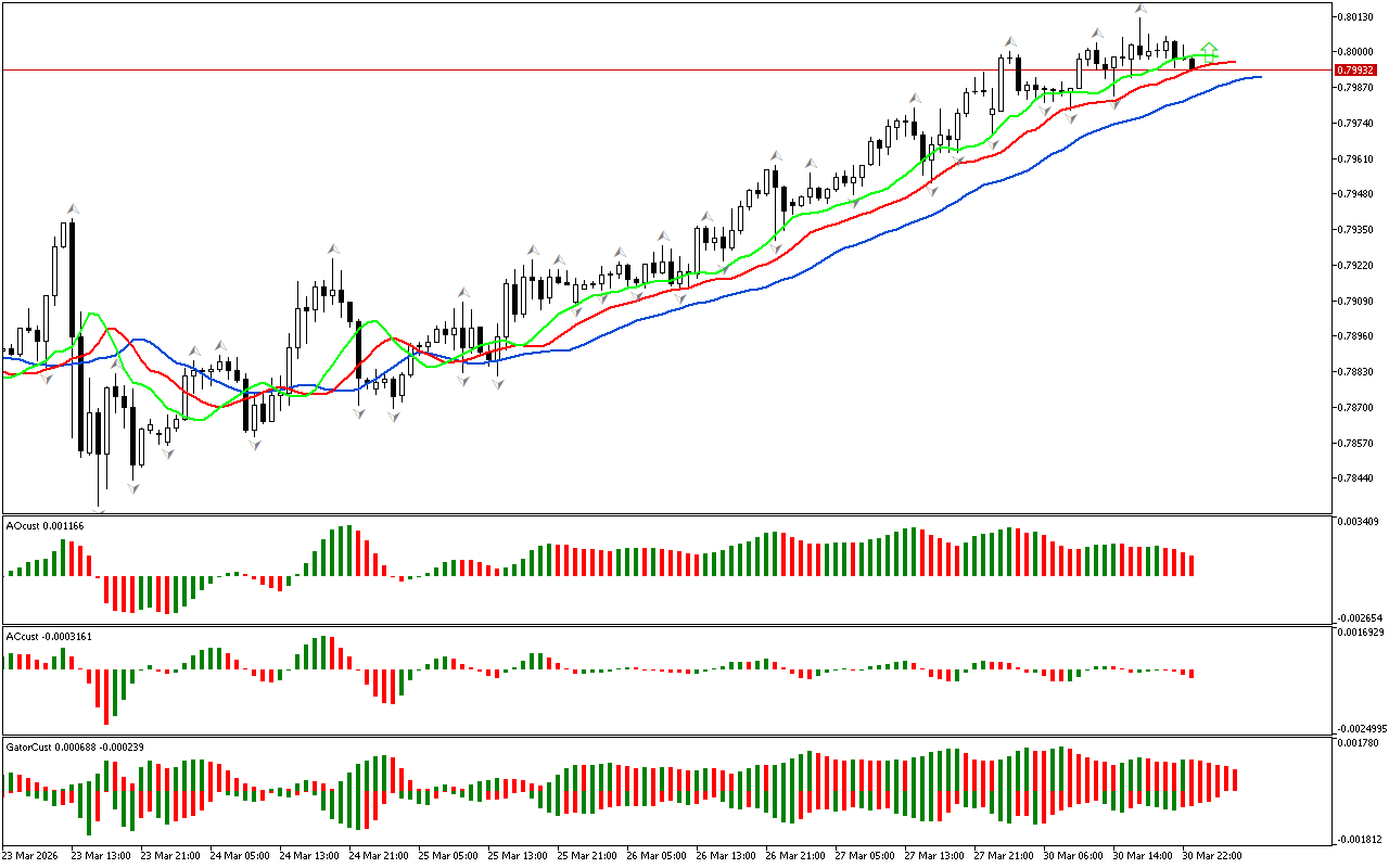 Gator indikatorining gistogrammasi hali aniq signal hosil qilmagan. Gistogrammalarning rangi o’zgaradi, bu bozor fazasining o’zgarishini ko’rsatadi.