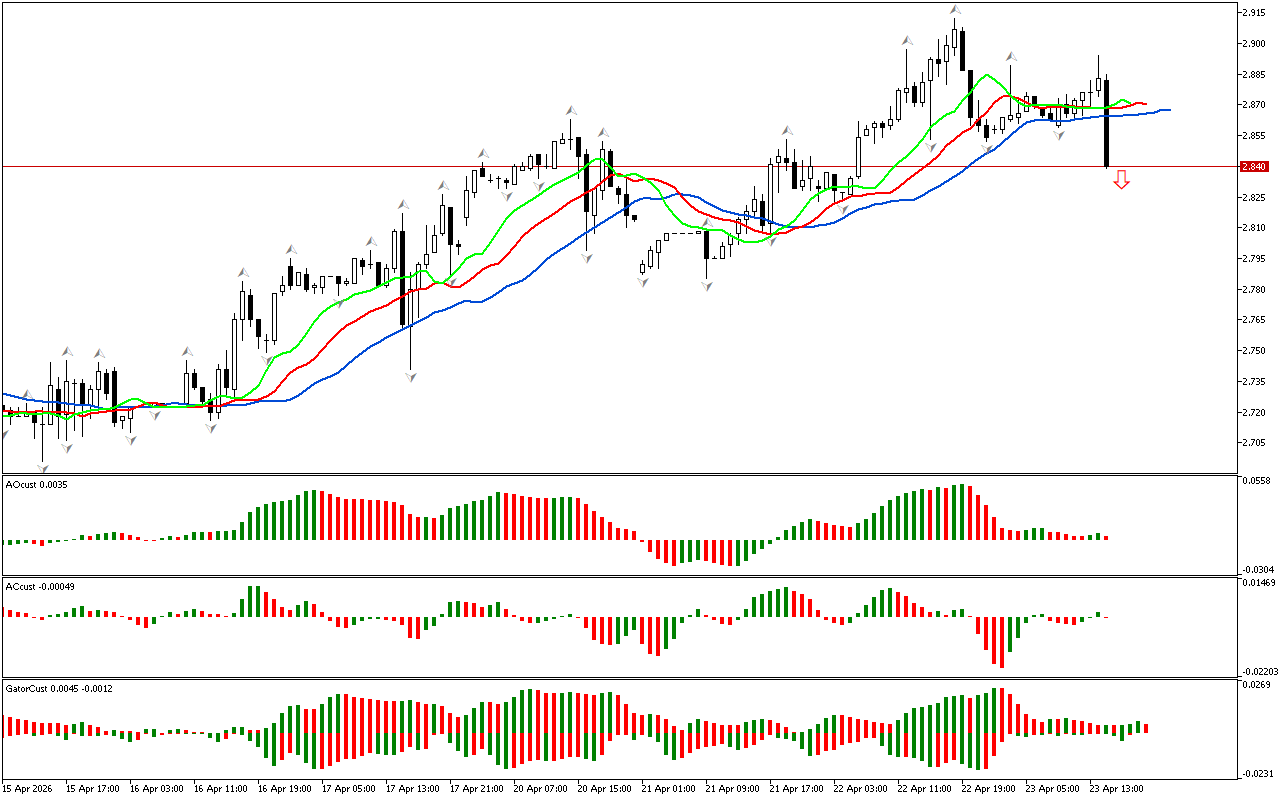 Ситуација на Natural Gas недефинисана. Ниједан од фрактала није сломљен, тако да игноришемо сигнале других индикатора. Током овог временског периода, препоручујемо да се уздржите од активних акција и чекате да се у стратегији појаве јасни сигнали. Пробој горњег или доњег фрактала помоћи ће нам да одредимо у ком правцу да се крећемо.