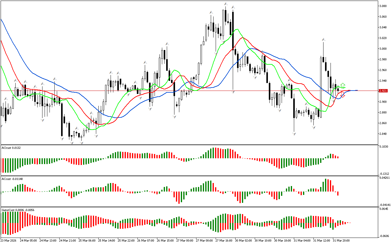 ฮิสโทแกรมของตัวบ่งชี้ Gator ยังไม่สร้างสัญญาณที่ชัดเจน สีของฮิสโทแกรมจะเปลี่ยนไป ซึ่งบ่งบอกถึงการเปลี่ยนแปลงในช่วงของตลาด