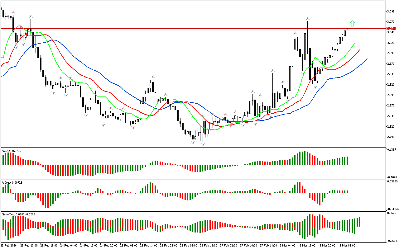 Колір гістограм індикатора Gator змінюється, тому цей індикатор ще не сформував чіткого сигналу.
