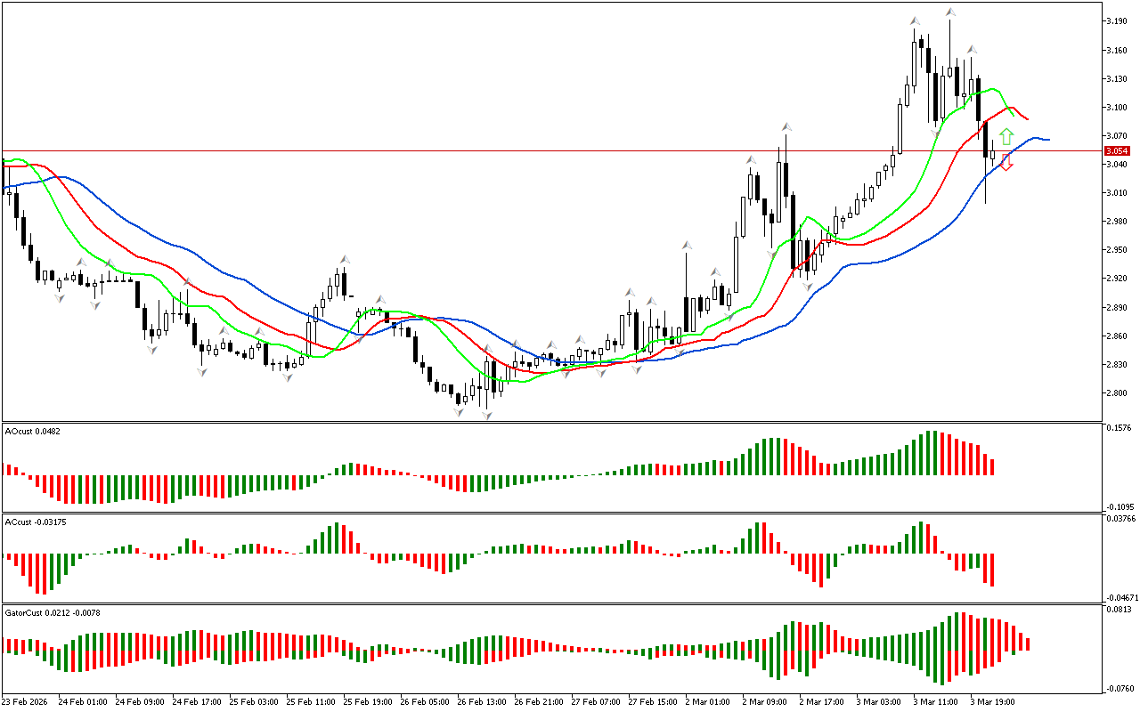 Колір гістограм індикатора Gator змінюється, тому цей індикатор ще не сформував чіткого сигналу.