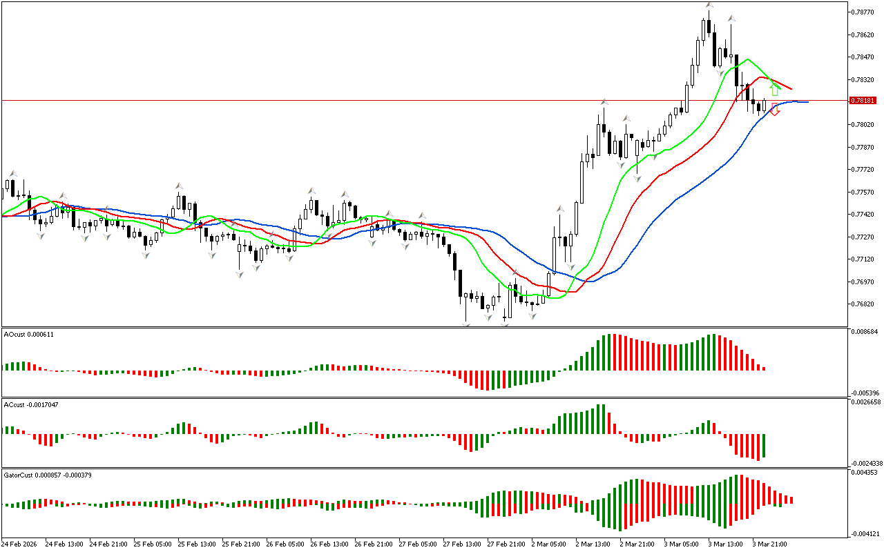 Як видно, індикатори AC і AO зелені. Є ознаки розвитку корекції або зміни локальної тенденції. Сила і енергія руху вниз відчувають уповільнення, але ціна залишається нижче червоної лінії Алігатора. Тому рух вниз залишається пріоритетним.
