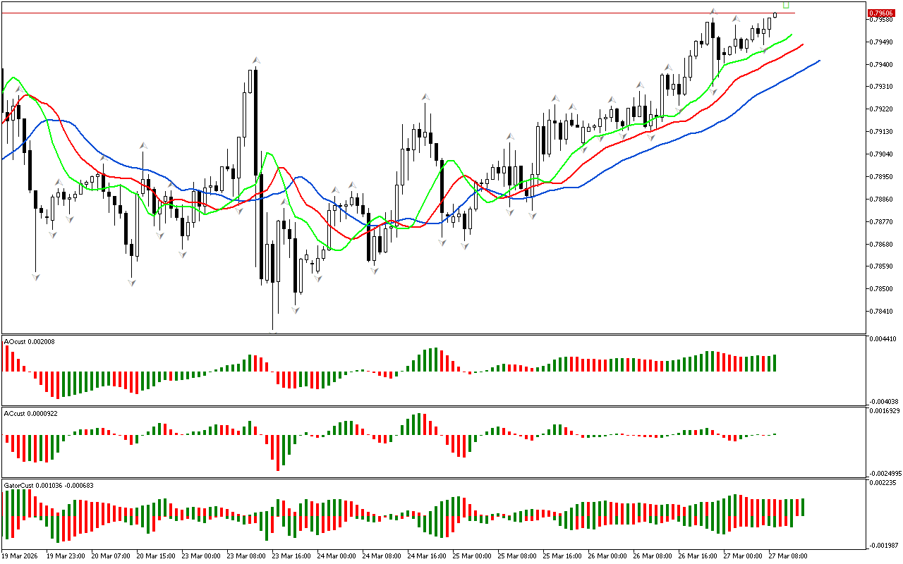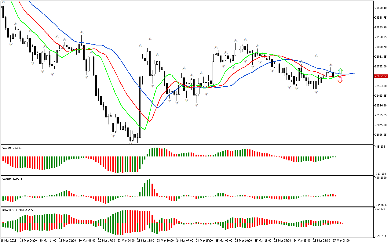 Останній сформований бар на індикаторах AO, AC і Gator зафарбован в зелений колір. Цей сигнал може свідчити про посилення позитивних настроїв ринку. Трейдери можуть розглядати це як підтвердження поточного висхідного руху та зважувати варіанти відкриття або збільшення довгих позицій.