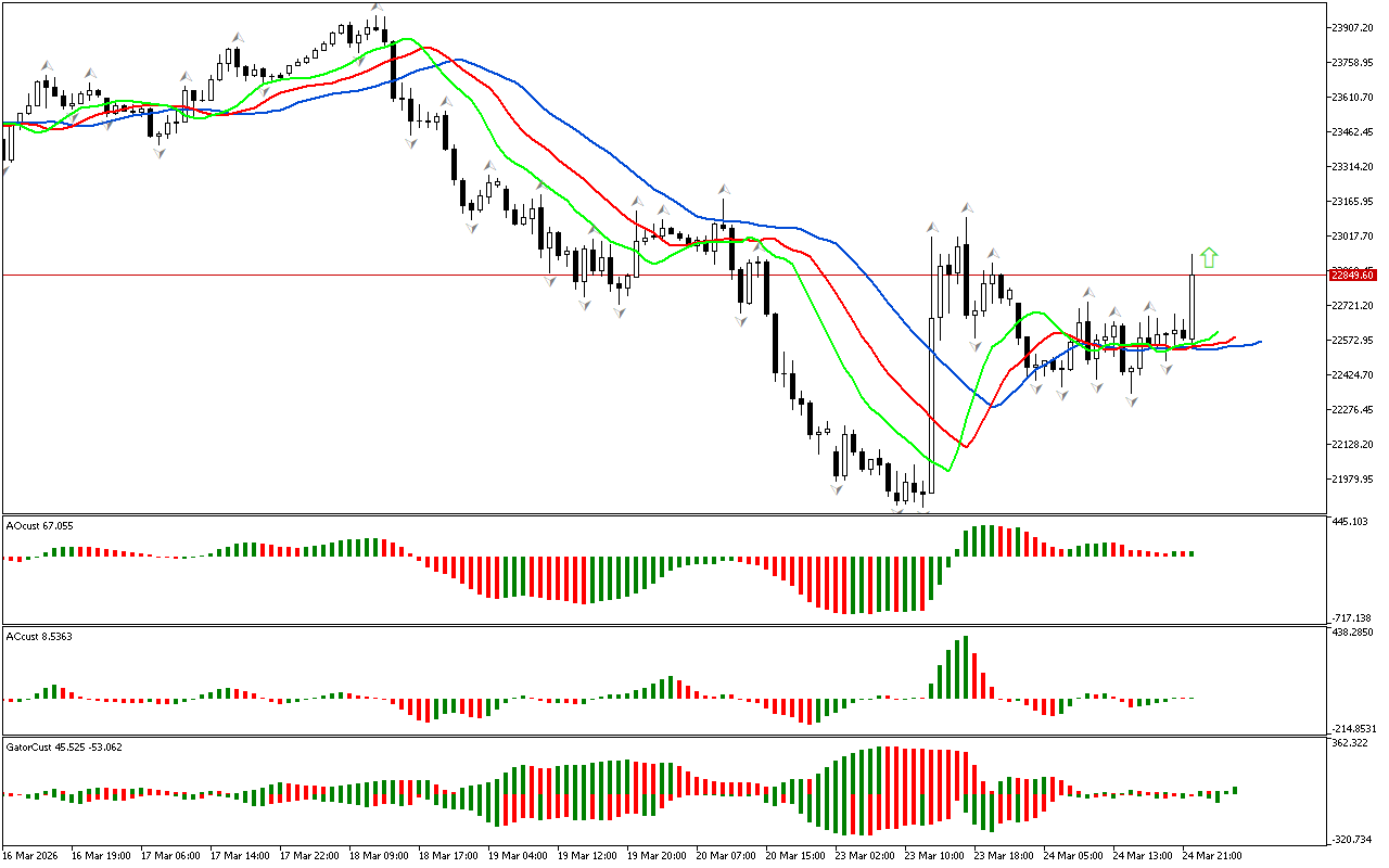 На індикаторі Accelerator Oscillator ми бачимо кілька зелених барів під нульовою позначкою. Це позитивний сигнал для ринку. Зростає енергетика північного напрямку руху.