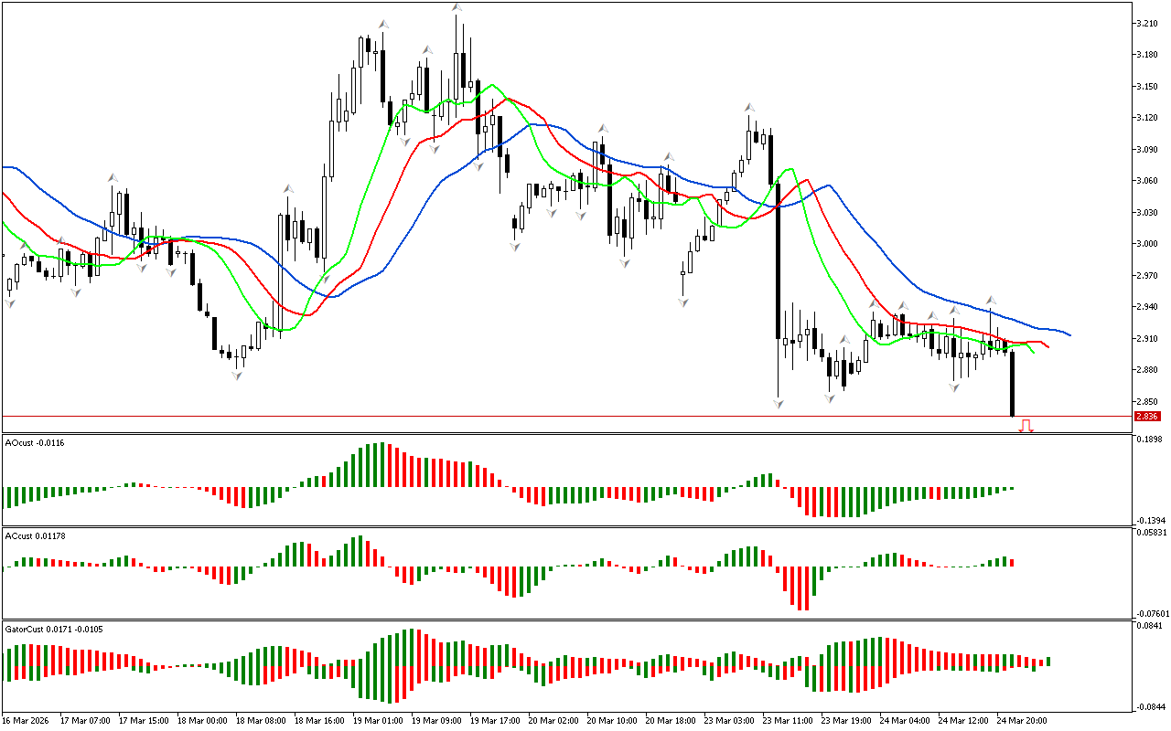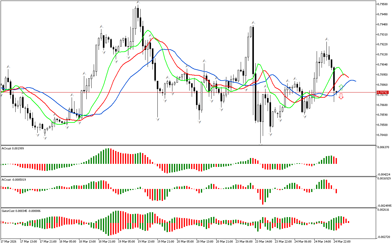 Колір гістограм індикатора Gator змінюється, тому цей індикатор ще не сформував чіткого сигналу.