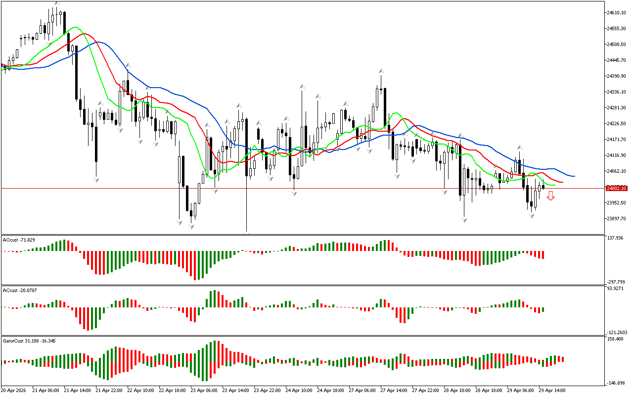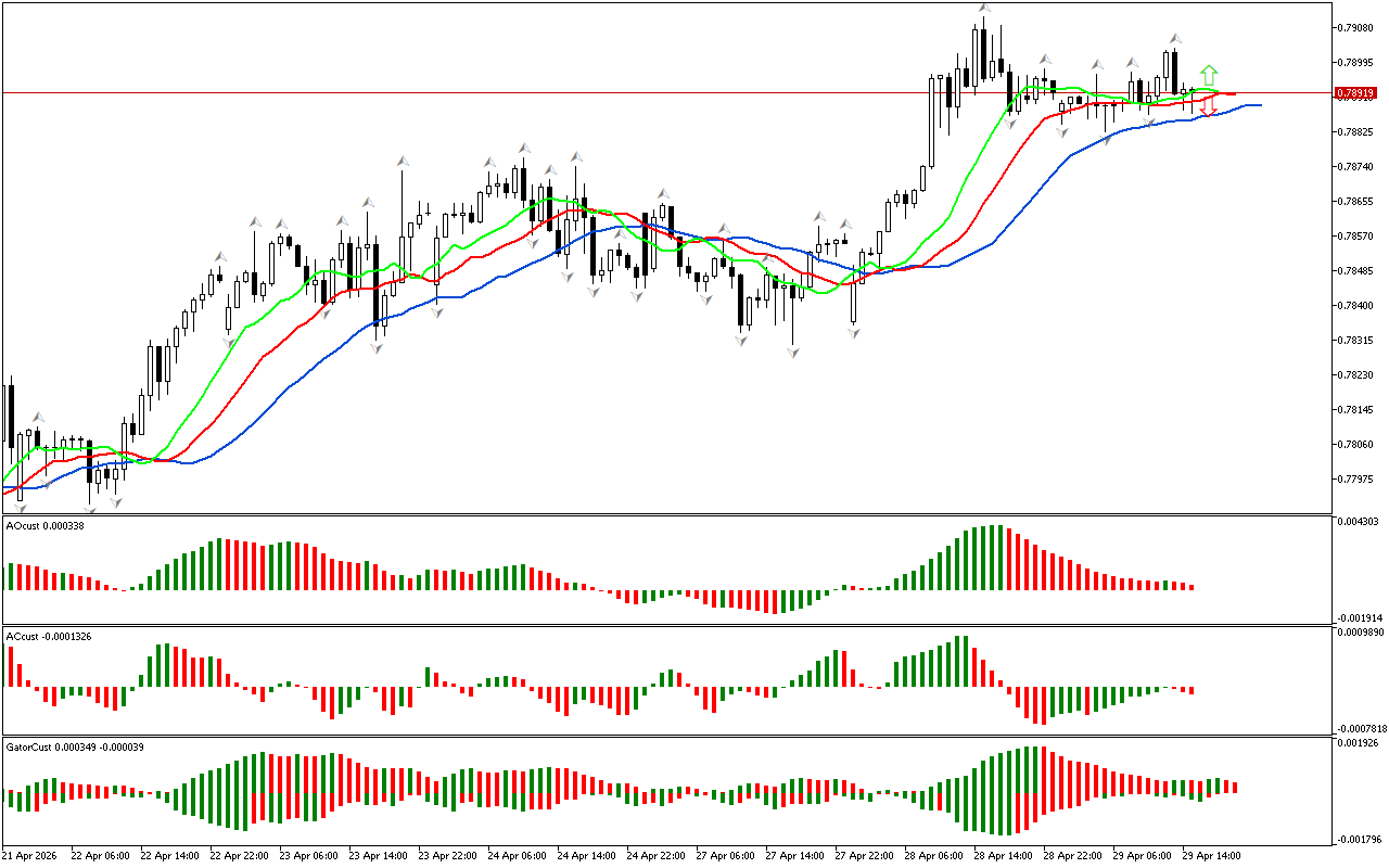 Shu bilan birga, AC va AO indikatorlari qizil rangga aylandi. Bu yuqoriga ko’tarilgan impulsning kuchi va energiyasi sekinlashuvga ega ekanligini ko’rsatadi. Bu chuqurroq tuzatishning rivojlanishiga yoki trendning o’zgarishiga olib kelishi mumkin. Biroq, shimoliy harakat stsenariysi, narx qizil Alligator chizig’idan yuqori bo’lib qolsa, keng tarqalgan bo’lib qoladi.